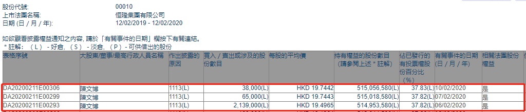 智通财经APP获悉,联交所最新资料显示,2月6日、7日及10日,执行董事陈文博增持恒隆集团(00010)213.9万股、6.5万股、3.8万股,合计224.2万股,每股分别作价为19.4965港元、19.7443港元及19.7442港元,总金额约为4373.67万港元。增持后最新持股数目约为5.15亿股,最新持股比例为37.83%。