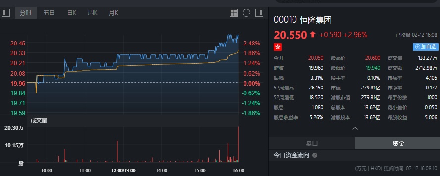 截至今日收盘,恒隆集团(00010)涨2.96%,报20.55港元。