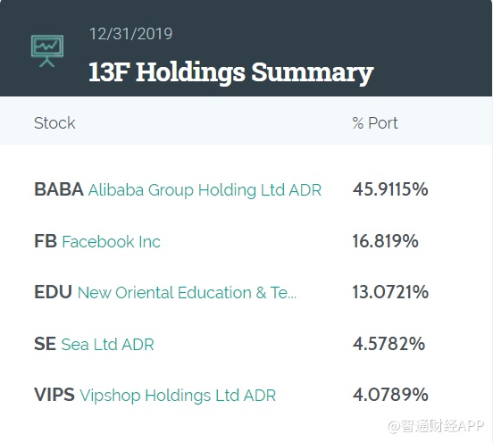 值得注意的是,前五大重仓股中,阿里巴巴(BABA.US)仍以45.9115%的占比稳居第一,占比较三季度上涨0.92%,Facebook(FB.US)、新东方(EDU.US)分别排名第二第三,排名不变。本季度Sea Ltd(SE.US)及唯品会(VIPS.US)排名第四及第五位。