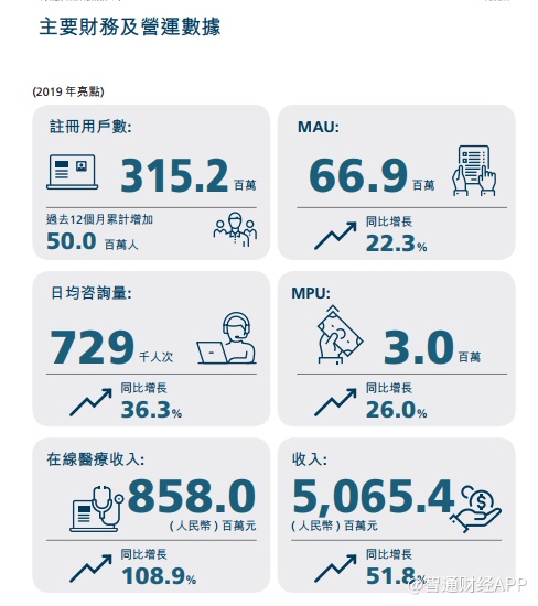 根据数据显示,2019年,平安好医生总收入50.65亿元,同比增长52%。其中,核心业务在线医疗收入达8.58亿元,同比增长109%;至2019年12月31日,注册用户数达到3.15亿人,同比增长18.9%;期末月活跃用户数和期末月付费用户数分别达6690万人和300万人,同比分别增长22.3%和26.0%。
