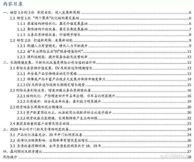 我们认为公司长期基本面稳定,转型2.0有望给公司发展带来新动能。公司寿险业务的价值发展、产险业务盈利及增速改善、投资端长周期的稳健性以及高于同业的股东回报均是公司估值的溢价项,此外20年公司负债端预计较18、19年显著改善,保守的分部估值(寿险1倍P/EV、财险0.9倍PB、其他版块0.8倍PB且集团折价15%)对应市值3969亿元,给予2020年目标价43.80元,较当前有31%的空间,首次覆盖给予“买入”评级。