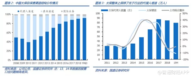 1.1.1 渠道结构持续优化,奠定价值发展基础2010年公司总保费中银保渠道占比54.9%,个险渠道占比仅40.2%。此后公司开始聚焦营销,砍银保趸交、做大个险业务,个险渠道占比显著提升,16年已经占到公司总保费收入的84.0%,且趋势上仍在持续提升。与此同时,太保月均代理人数量由2011年的29.2万人增长到2018年的84.7万人,年复合增速16.4%,超越上市同业整体13.6%的增速。