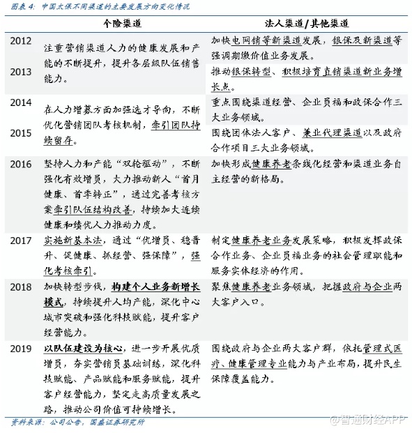 其他非个险渠道方面公司也在转型的过程中进行持续的探索:12年公司强调电网销等新渠道发展、13年推动银保渠道转型、15年也提及了兼业代理渠道发展,最终形成了以个险渠道为核心、团险业务围绕企业及政府提供健康养老医疗等专业能力的渠道布局。