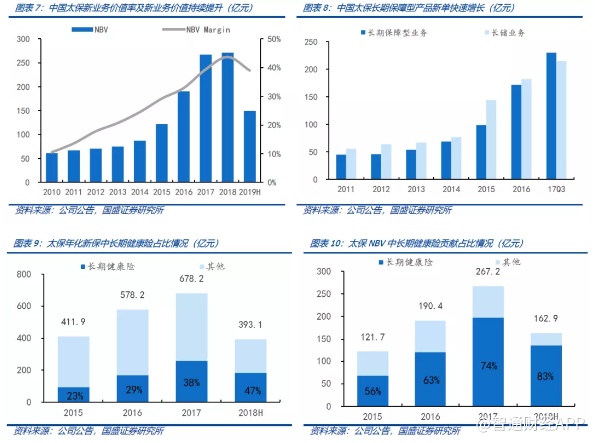 1)、整体价值率持续提升且当前处于同业中较高水平:价值率是公司包括渠道结构、险种结构、期限结构、产品设计等多因素综合的结果,公司自2010年以来margin水平逐年提升,由10年的10.5%提升至19H的39.0%,处于上市同业的较高水平。