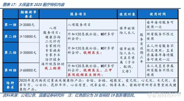 “太保蓝本”通过健康管理提升公司服务品质:公司于19年4月正式发布“太保蓝本”服务体系,主要推进两大项目:重疾绿通计划以及医疗特权服务,19年底覆盖超过750万客户,其中重疾绿通包括了重疾专家预约、专家手术、专家病房、120急救补贴等四项服务;医疗特权服务需要满足一定的新单及险种要求,可享受包括健康咨询、专家预约、专家手术、海外就医协助等十余种健康服务。2020年以来“太保蓝本”也进行了包括服务品质升级、内容优化等跟进,有利于在产品趋同的市场下塑造竞争优势,实现新单促成及服务品质提升。