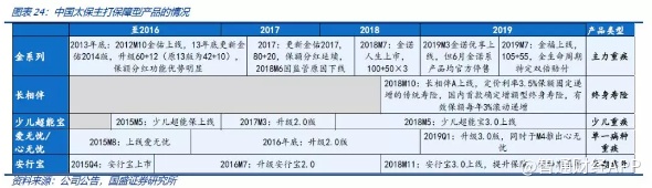 多种保障产品覆盖不同客群、不同保障诉求:除了主力金系列以外,公司保障型产品还针对不同客群、不同保障诉求完善了整个产品体系。如对于少儿专属重疾保障的“少儿超能宝”;对老年群体专属防癌保障银发安康等。对不同的保障诉求,推出了针对防癌、心脑血管疾病的单一病种重疾爱无忧、心无优;满足养老+保障+财富传承需求的终身寿险长相伴;满足长期意外保障需求的安行宝等,构成公司完善的产品体系。