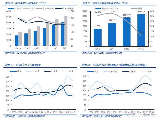 公司整体稳健的负债业务推动EV及剩余边际在长周期保持优于行业的增长。近十年来太保寿、太保ROEV增速均值分别达到21.2%、14.2%,长周期稳定增长且增速优于同业,集团EV也持续保持15%以上增速,预计太保寿19-21年EV增速分别为18.3%、16.3%、16.0%,集团EV增速分别为16.9%、15.2%、15.1%,具备长期投资价值。