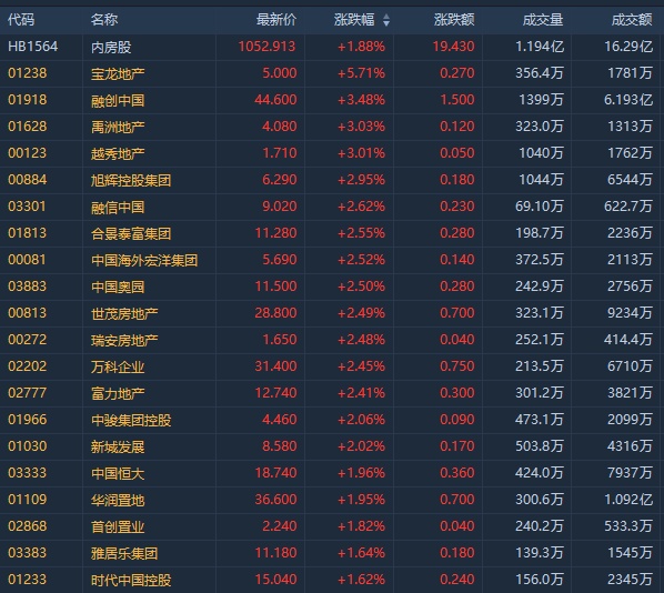 截至发稿,宝龙地产(01238)涨5.92%,报5.01港元;融创中国(01918)涨3.48%,报44.6港元;旭辉(00884)涨2.95%,报6.29港元;融信中国(03301)涨2.62%,报9.02港元;世茂房地产(00813)涨2.49%,报28.8港元。