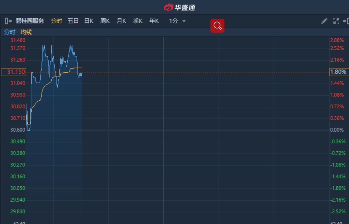 智通财经APP获悉,碧桂园服务(06098)发盈喜,年度净利同比预增逾50%。该股盘中升逾2%,高见31.4港元,刷新历史新高。截至10时30分,涨1.8%,报价31.15港元,成交额1.047亿。