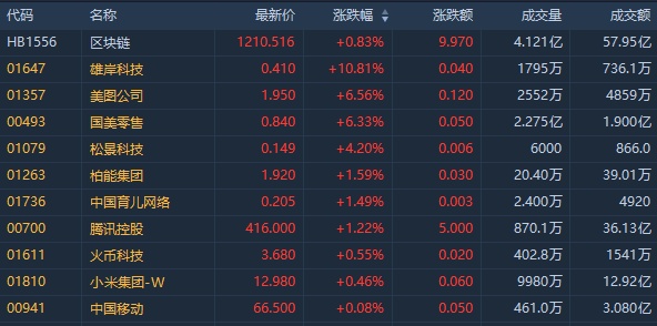 截至发稿,雄岸科技(01647)涨10.81%,报0.41港元;美图公司(01357)涨6.56%,报1.95港元;国美零售(00493)涨6.33%,报0.84港元;火币科技(01611)涨0.55%,报3.68港元。