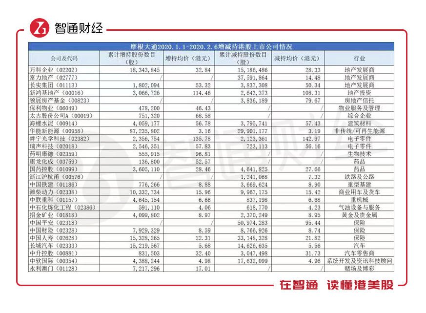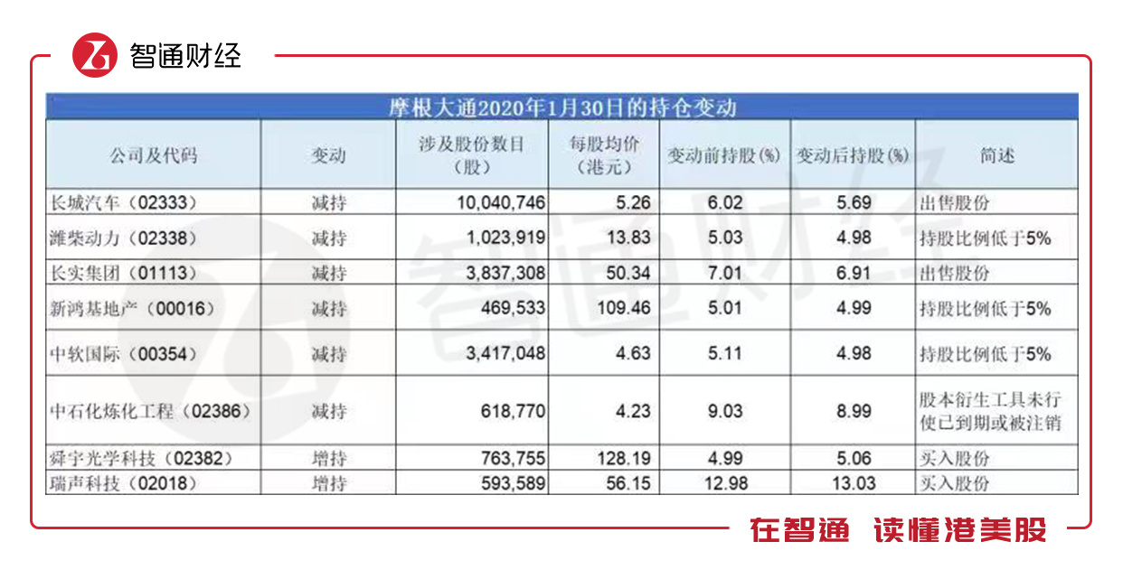 1月30日,受公共卫生事件影响,恒指单边下行跌超700点,全市场哀鸿遍野,当日摩根大通从二级市场减持了长实集团等6只股票,但增持了舜宇光学科技和瑞声科技,买入均价分别为128.19港元、56.15港元。