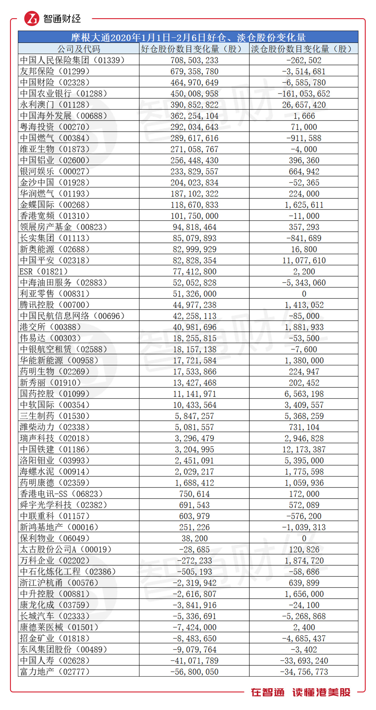 根据联交所的披露,智通财经还整体统计了所有摩根大通名义下(包括所控制的法团、投资经理、持有股份的保证权益的人、核准借出代理人)在1月1日-2月6日期间的持仓变化(含好仓及淡仓):