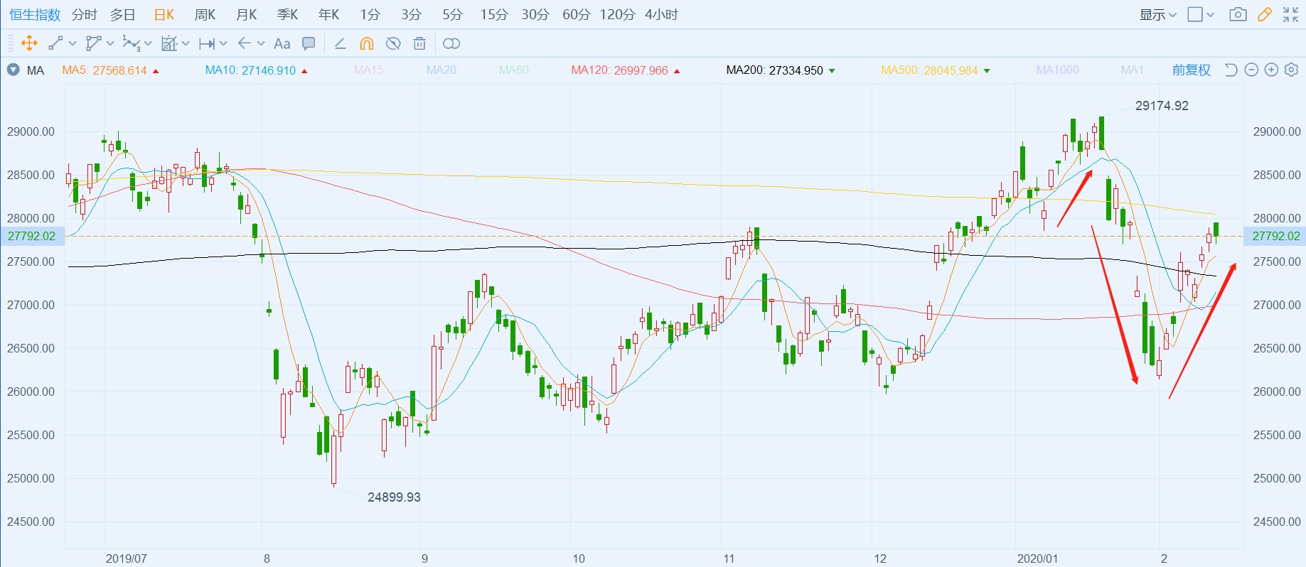 年初至今,恒指先扬后抑,最高曾达到29174.92点,1月下旬因为公共卫生事件接连受挫,节后开始逐步反弹,走出V型走势。中间有过上至29174.92点的狂欢,有过蓝筹股全线下跌的黑暗时刻,也有走出谷底的“劫后重生”。