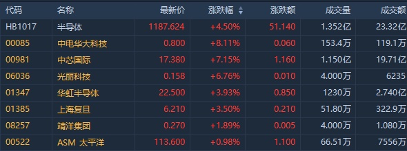 截至发稿,中芯国际涨6.91%,报17.34港元;华虹半导体涨4.16%,报22.55港元;上海复旦(01385)涨3.5%,报6.21港元;ASM太平洋(00522)涨0.98%,报113.6港元。