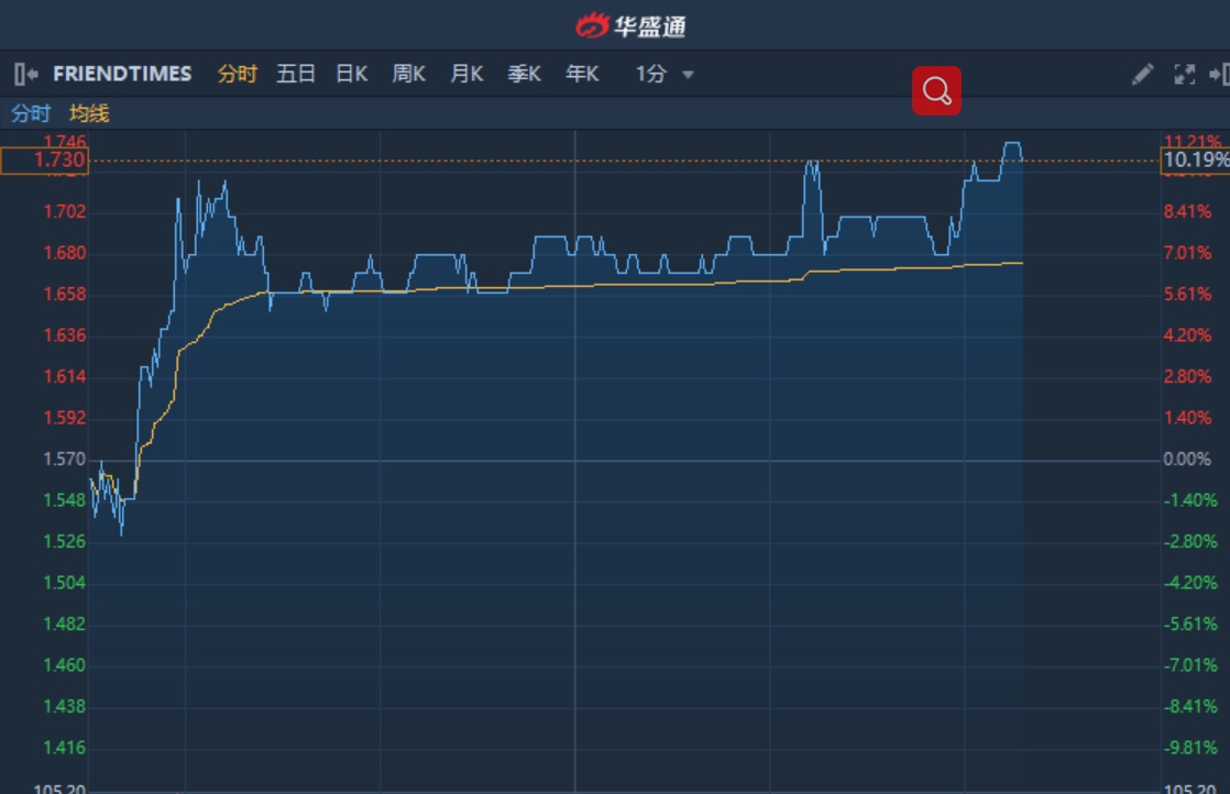 智通财经APP获悉,FRIENDTIMES(06820)近期股价连续破顶,收复发行价。该股午后高见1.74港元,再创上市新高。截至15时17分,涨10.19%,报价1.73港元,成交额5317万。