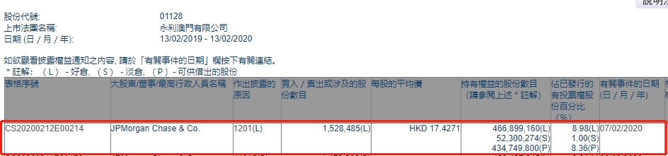 智通财经APP获悉,联交所最新资料显示,2月7日,摩根大通减持永利澳门(01128)152.8485万股,每股作价17.4271港元,总金额约为2663.71万港元。减持后最新持股数目约为4.67亿股,最新持股比例为8.98%。
