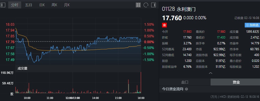 截至今日收盘,永利澳门(01128)无涨跌,报17.76港元。