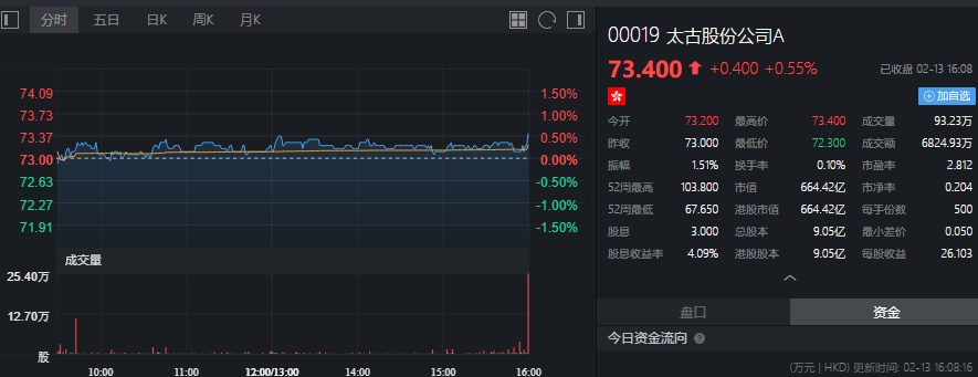 截至今日收盘,太古A涨0.55%,报73.4港元。
