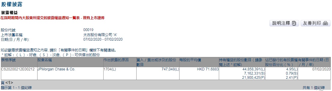 智通财经APP获悉,联交所最新资料显示,2月7日,摩根大通减持太古A(00019)