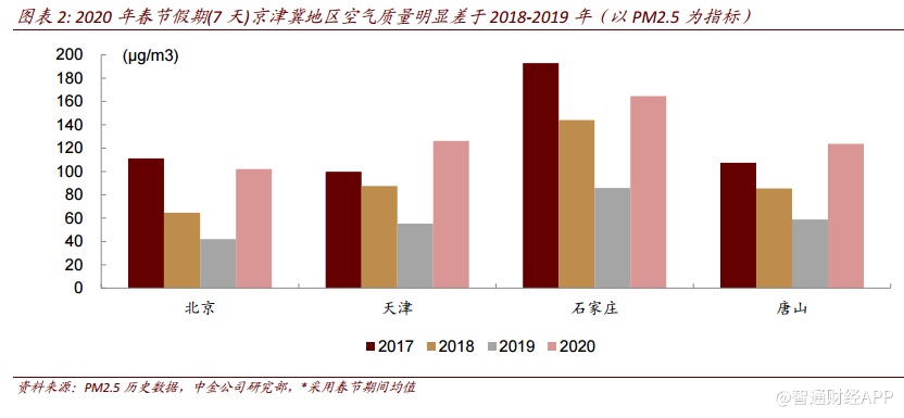 2020年春节,京津冀地区污染物浓度明显超过往年平均。以PM2.5来看,主要城市污染浓度分别较2019年春节期间提升91%-143%。