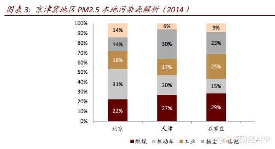 燃煤、机动车、工业排放与扬尘是污染物主要来源。2013-14年,我国环保部门组织了对京津冀地区的大气细颗粒物(PM2.5)的源解析。依据分析结果,PM2.5主要来源中燃煤占22%-29%,机动车占 15%-31%,工业端占17%-25%,扬尘占14%-30%。
