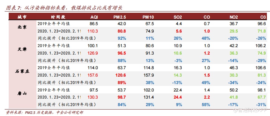** 从污染物浓度分析,农村燃煤排放浓度上升明显。京津冀重点城市污染物指标中,春节至今SO2浓度较2019年均值分别从下降13%至上涨26%不等;CO浓度上涨27%-55%;NO2浓度减少14%-34%。考虑到机动车污染排放对NO2影响更大,农村散煤燃烧污染对CO影响更大,工业企业污染对SO2影响更大,我们认为此次空气重污染事件可能更多来源于农村散煤燃烧。