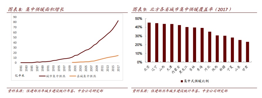 城区集中供暖覆盖率快速提升,但乡村难以部署。70 年代初到 2017 年末(目前综合统计数据覆盖的最新年份),北方城市、县城集中供热面积增长到97.7亿平方米,基于城市建成区面积、北方各省分省测算,集中供暖覆盖率在23%(甘肃最低)至45%(北京)的范围,但相比海外而言仍处于较低水平(从国外看,芬兰和丹麦等北欧国家城市集中供热覆盖率达 90%,全国平均水平在 60%以上)。而从县城的综合覆盖率数据角度看,当前的集中供暖比例仅达到城市的一半。镇、乡、及广大农村地区则缺乏集中供暖设施。