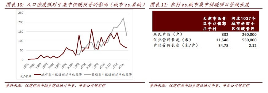 ** 农村人口密度低造成集中供暖的管线长度远高于城市。对比天津市西青区辛口镇郭庄子村的集中供暖和河北各市小区供暖管网更新过程,农村平均连接每户居民管线长度约为城市的17倍。按照供暖管线投资600-700元/米测算,农村相较城市平均每户接入集中供暖管网需要额外投资上万元。