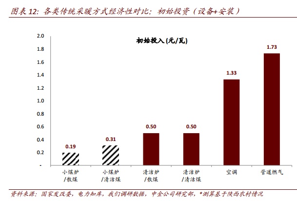 经济性是农村煤改气和煤改电难以实际执行的原因。考虑到农村较低的人口密度和居住密度,集中式采暖投资成本显著增加,因此当前农村主要使用分布式采暖的方式。我们测算燃煤取暖采购安装成本约0.5元/瓦,仅为燃气和空调的29%-38%,运营成本约0.22元/千瓦时,仅为燃气和空调的44%-73%,经济性显著。因此对于价格敏感性较高的农村居民而言,更加青睐燃煤采暖方式。