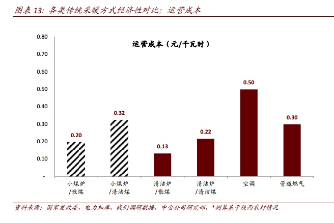 ** 运营阶段成本,燃煤<燃气<<电采暖。尽管清洁煤炉的初始购置成本高于传统煤炉,但考虑到其热效率可从传统煤炉的约40%提升至约60%,我们预计在供给同等热能量的情况下,清洁煤炉有望削减后续用煤成本约 35%。在与燃气供暖、电供暖的比较方面,我们预计清洁煤炉的单位产热成本在0.22元/千瓦时以内,低于空调和燃气的 0.50/0.30 元/千瓦时。
