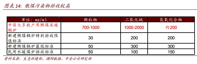 国家对于民用水暖炉(燃煤取暖)的排放标准很高。2018 年最新的《民用水暖煤炉通用技术条件》中要求颗粒物、二氧化硫、氮氧化物排放浓度分别不超过 50、100、150mg/m3。但是根据我们调研的情况,实际上中国部分户用燃煤采暖颗粒物、二氧化硫、氮氧化物排放浓度最高能够达到为 700-1000,1000-2000,200mg/m3。