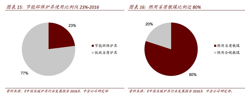 没有使用节能环保炉具和燃用劣质煤炭是散煤燃烧超标的重要原因。根据采暖炉具行业研究数据,2016年使用节能环保炉具的比例仅占23%,而燃烧使用劣质散煤的比例近80%。我们认为最主要的问题是经济性的问题,根据我们调研的情况,散煤相比于符合标准的煤炭(低硫、清洁型),价格便宜一半以上。而节能环保炉具由于体积和材质要求更高,销售价格一般在2000元以上,远远高于售价仅几百元的低效劣质炉具。