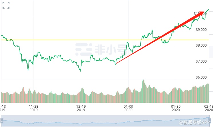 但也应该注意到,为何嘉楠科技的涨幅远远高于其他的概念股?智通财经APP认为,出现如此现象的原因与以下三点有很大关系。其一,数字货币行情回暖时嘉楠科技股价持续走低。自国内的公共卫生事件爆发以来,比特币价格持续走高。据非小号数据显示,截至2月11日时,比特币今年的价格已上涨34%。在2月12日鲍威尔的讲话后,比特币价格一举突破1万美元大关。