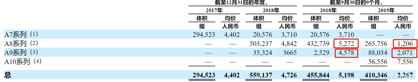 据招股书显示,2019年前9个月时,嘉楠科技A8系列矿机的均价为1206元人民币,同比直降4066元。而A9系列矿机的均价为2071元,同比直降2507元。