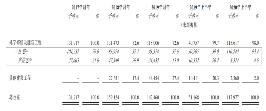 于业绩纪录期间,该公司已完成77项楼宇修缮及翻新项目以及14项其他建筑项目。于2019年9月30日,其有29项正在进行的楼宇修缮及翻新项目以及3项其他建筑项目,合约总额为7.627亿港元。