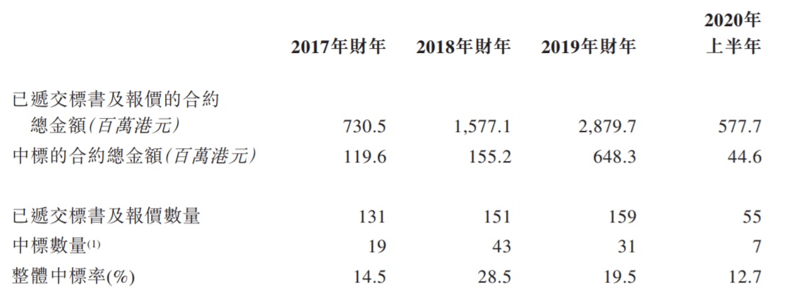 近几年其中标率起伏不定,2017年、2018年、2019年及2020年上半年分别为14.5%、28.5%、19.5%及12.7%。