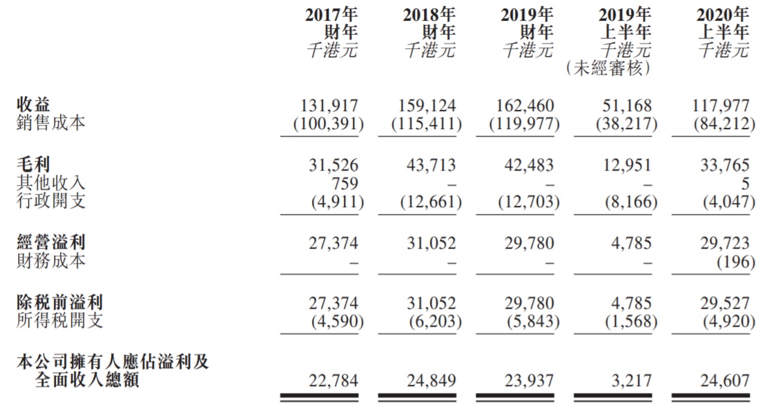 2017年、2018年、2019年及2020年上半年,该公司收益分别为1.31亿港元、1.59亿港元、1.62亿港元及1.17亿港元;毛利分别为3162.6万港元、4371.3万港元、4248.3万港元及3376.5万港元。