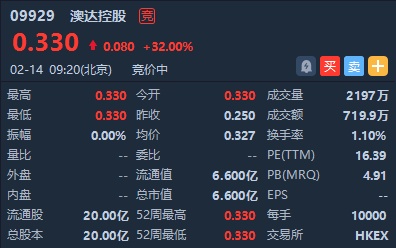 智通财经APP获悉,澳达控股(09929)首日挂牌,公告显示,公司发行5亿股,每股定价0.25港元,每手10000股,所得款项净额约7100万港元。截至发稿,涨32%,报0.33港元,成交额719.9万港元。