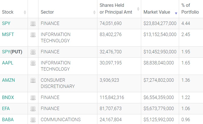 在前五大重仓股中:标普500指数ETF(SPY.US)位列第一,占比4.44%,持仓约7405万股,价值约238.34亿美元。微软(MSFT.US)位列第二,占比2.45%,持仓约8340万股,价值约131.52亿美元。标普500指数ETF看空期权(SPY.US,PUT)位列第三,占比1.95%,持仓约3247万股,价值约104.52亿美元。科技股苹果(AAPL.US)和亚马逊(AMZN.US)分别位列第四和第五,占比分别为1.65%和1.36%,其中苹果持仓约3010万股,市值约为88.38亿美元。亚马逊持仓约394万股,市值约为72.74亿美元。