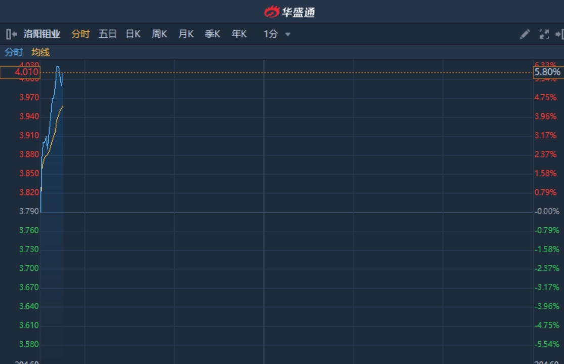 洛阳钼业早盘AH股同步上扬,涨幅均超5%,截至9时44分,涨5.01%,报价3.98港元,成交额6716万。