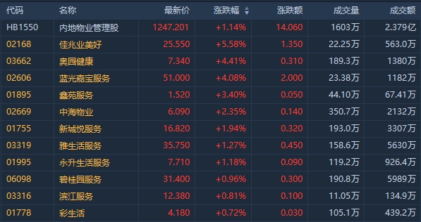 截至发稿,鑫苑服务(01895)涨6.12%,报1.56港元;佳兆业美好(02168)涨5.37%,报25.5港元;奥园健康(03662)涨4.13%,报7.32港元;碧桂园服务(06098)涨0.96%,报31.4港元。