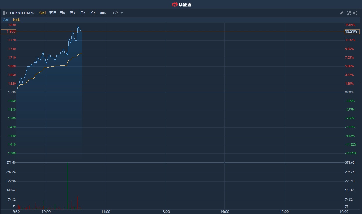 智通财经APP获悉,受公共卫生事件影响,移动游戏数据亮眼。FRIENDTIMES(06820)股价自年初至今持续攀升,累积涨幅已超八成。今日早盘再涨逾13%,盘中高见1.83港元,股价刷新历史新高。截至发稿,涨13.21%,报1.8港元,成交额2196.65万港元。
