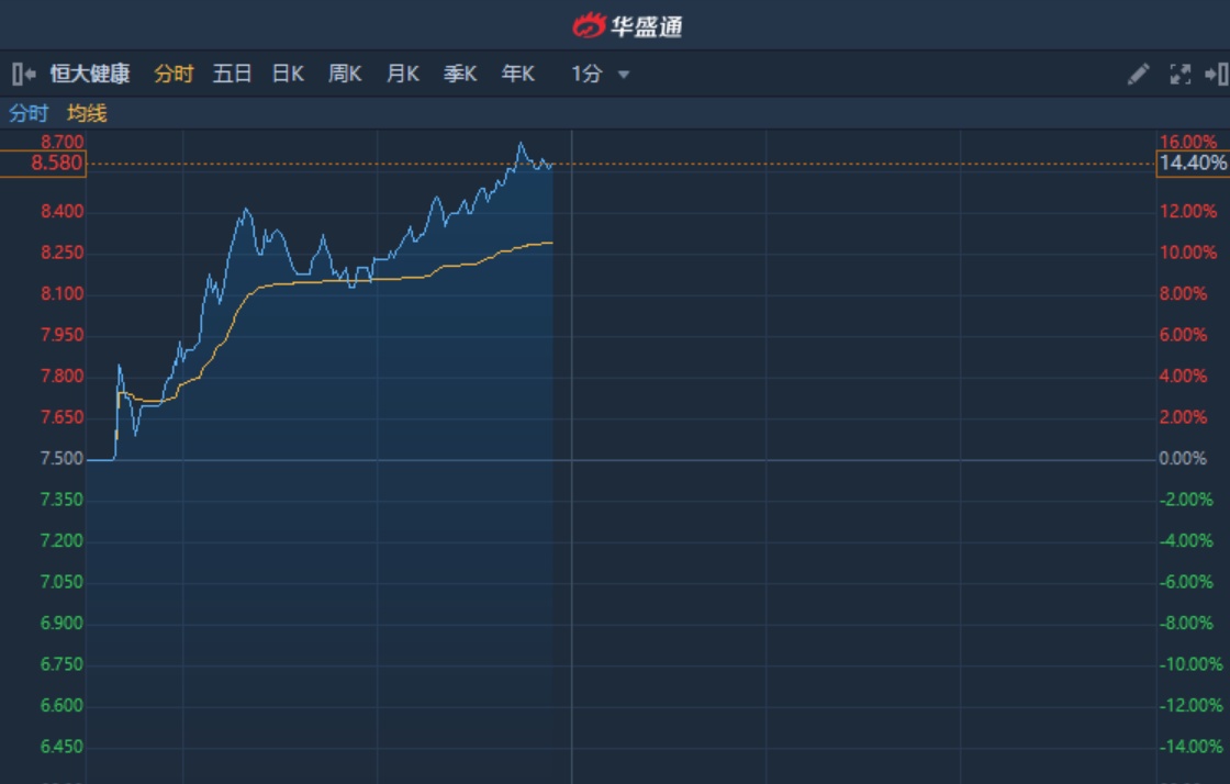 智通财经APP获悉,恒大健康(00708)盘中突获资金追捧,股价直线拉涨逾14%,突破多条均线,截至11时53分,涨14.4%,报价8.58港元,成交额5639万。