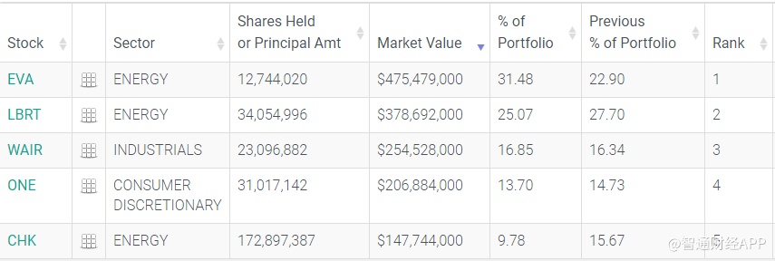 与三季度相同,四季度,Liberty Oilfield(LBRT.US)、Enviva合作伙伴(EVA.US)、西科国际(WAIR.US)、精锐教育(ONE.US)和Chesapeake Energy(CHK.US)依旧是重仓前五位。其中,中概股精锐教育(ONE.US)由第三季度的第五位上升至第四位,占比约13.7%。