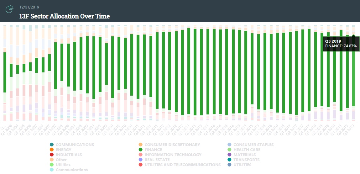 本季度,桥水持仓的偏好依然保持不变,金融类标的依然占据绝对多数,占比为74.87%。第二大为原材料标的,占比8.19%。其余占比皆不超过4%。