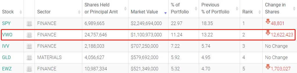 在前五大重仓标的中:标普500指数ETF(SPY.US)位列第一,占比22.97%,持仓约699万股,价值约22.49亿美元。先锋新兴市场ETF(VWO.US)虽然占比11.24%,持仓市值约11亿位列第二,但环比降低了33%。第三位是iShares核心标普500 ETF(IVV.US),占比7.22,市值约为7亿美元。第四第五分别是SPDR黄金信托(GLD.US)和iShares MSCI巴西指数(EWZ.US),市值分别约为5.79亿和5.21亿美元。