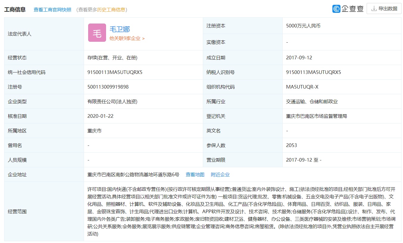 重庆京邦达物流有限公司成立于2017年9月,由京东物流的运营主体北京京邦达贸易有限公司全资控股,公司疑似实际控制人为刘强东。