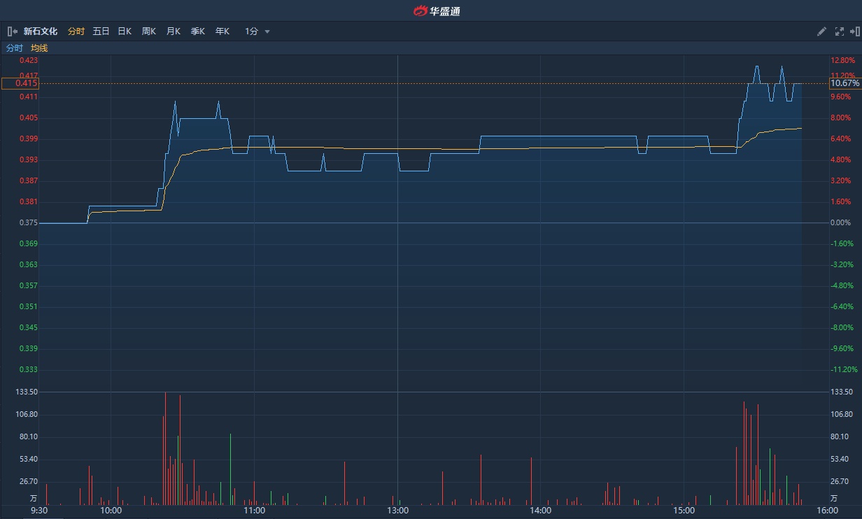 智通财经APP获悉,次新股新石文化(1740)自上市以来股价持续阴跌,今日尾盘重获资金追捧,股价高见0.42港元,较招股价0.5港元仍低一成半。截止发稿,涨10.67%,报0.415港元,成交额1089.22万港元。
