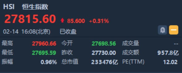 智通财经APP获悉,恒指早盘低开31.44点或0.11%,报27698.56点。截至收盘,恒生指数涨85.6点或0.31%,报27815.6点,全日成交额达957.83亿。国企指数涨0.26%,报10863.45点,红筹指数跌0.1%,报4357.78点。