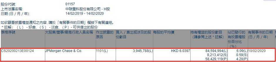智通财经APP获悉,联交所最新资料显示,2月10日,摩根大通增持中联重科(01157)394.5788万股,每股作价6.0397港元,总金额约为2383.14万港元。增持后最新持股数目约为8459.50万股,最新持股比例为6.09%。